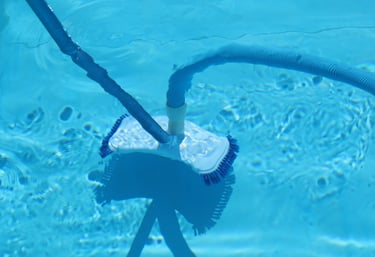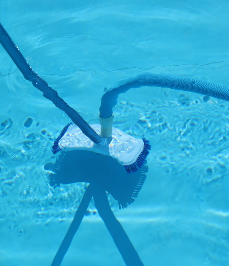 A professional cleaning a sparkling blue swimming pool on a sunny day.